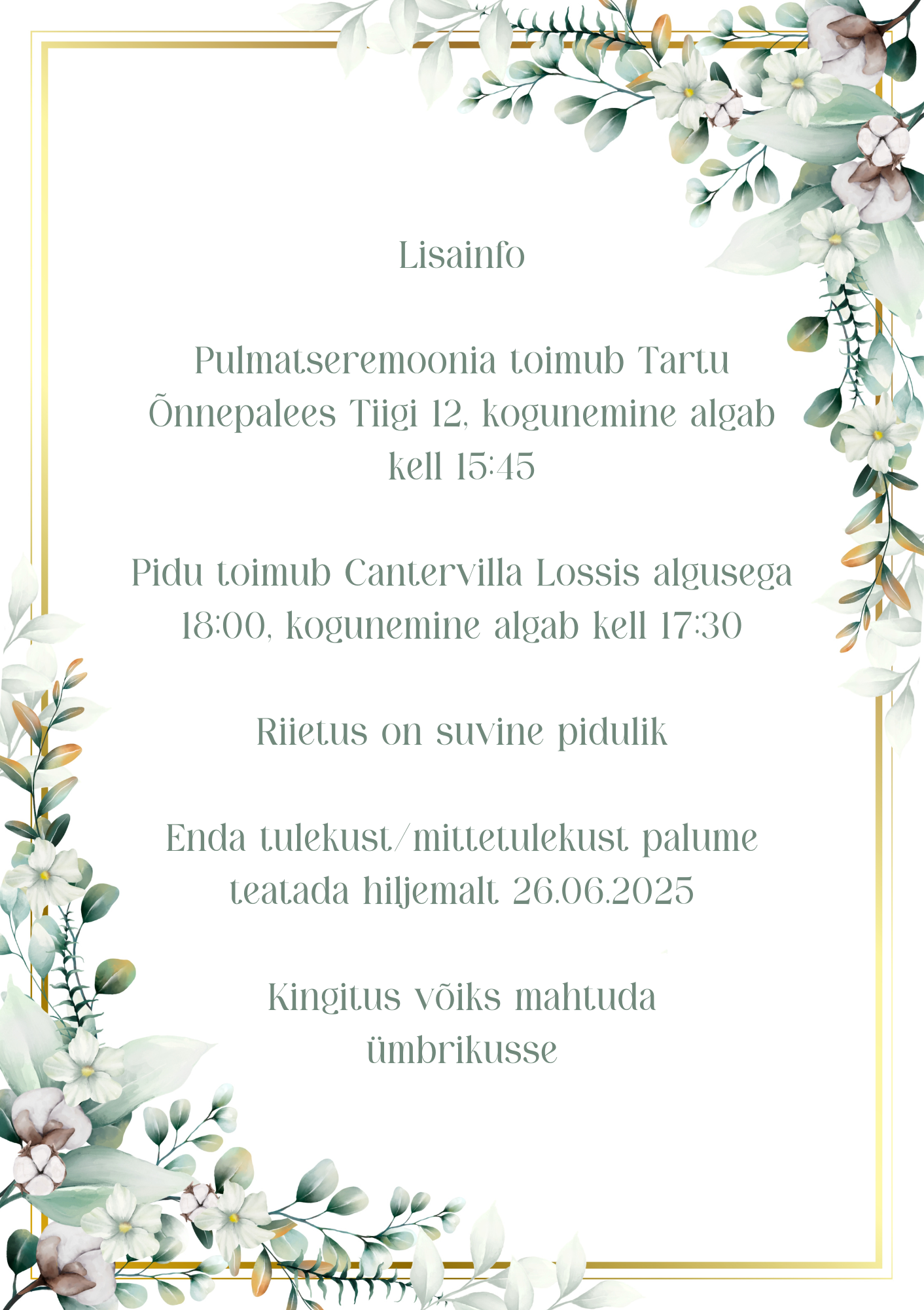 Iga pulmakutse valmib personaalselt teie jaoks. Lisaks pulmakutsetele on võimalik tellida samas stiilis: