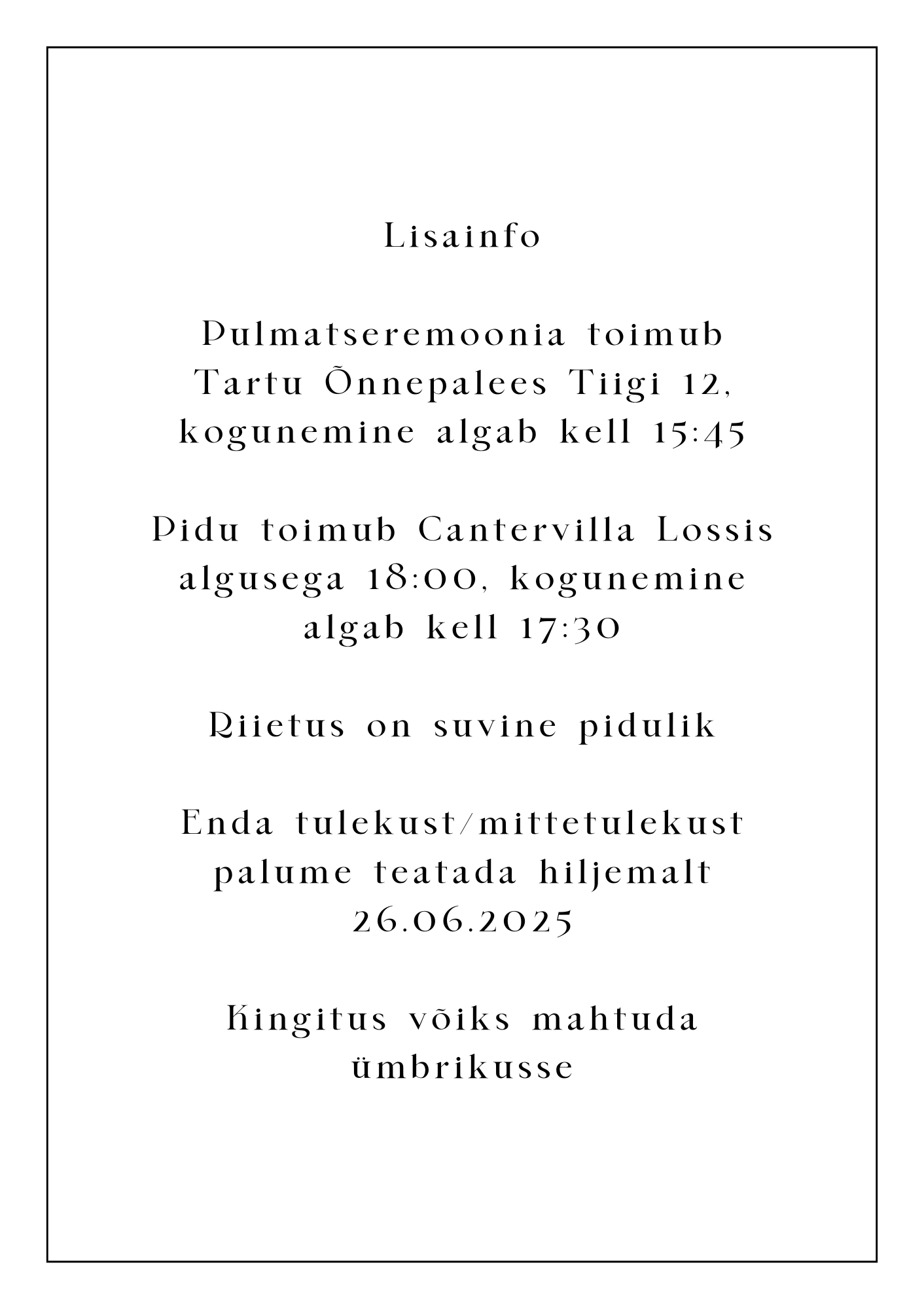 Iga pulmakutse valmib personaalselt teie jaoks. Lisaks pulmakutsetele on võimalik tellida samas stiilis: